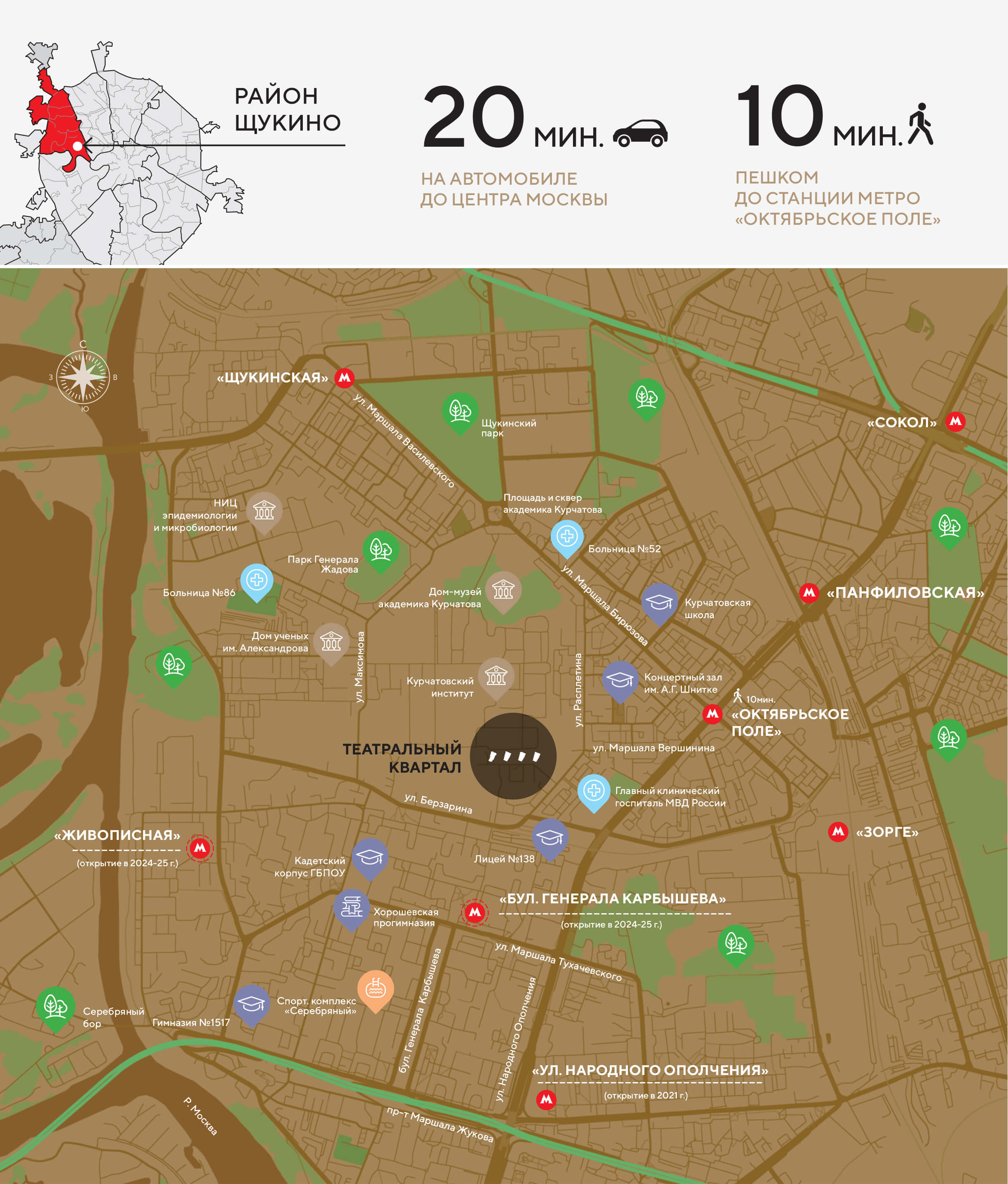 Жилой дом расположен в престижном районе Щукино, рядом с национальным исследовательским центром, одним из главных научных предприятий страны – Курчатовским институтом. Вокруг института еще с советского времени государство строило престижные дома, квартиры в которых передавали представителям интеллигенции: инженерам, ученым, врачам, научным деятелям. Это повлияло на формирование особой социальной среды в районе Щукино. Продолжая градостроительные традиции советского времени, концерн «КРОСТ» создает для москвичей архитектурный проект, который напоминает лучшие дома эпохи 20 века, но с использованием последних современных технологий.