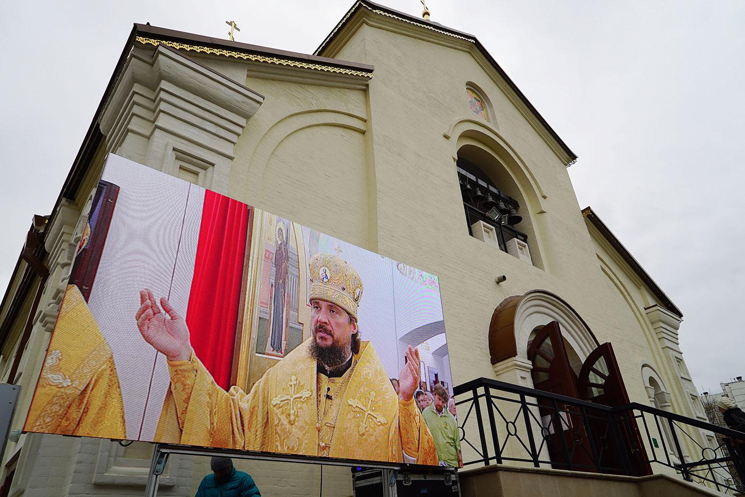 На телеканале «Союз» шла прямая трансляция богослужения. Для удобства верующих богослужение транслировалось на большом экране, установленном Концерном «КРОСТ» перед храмом.
