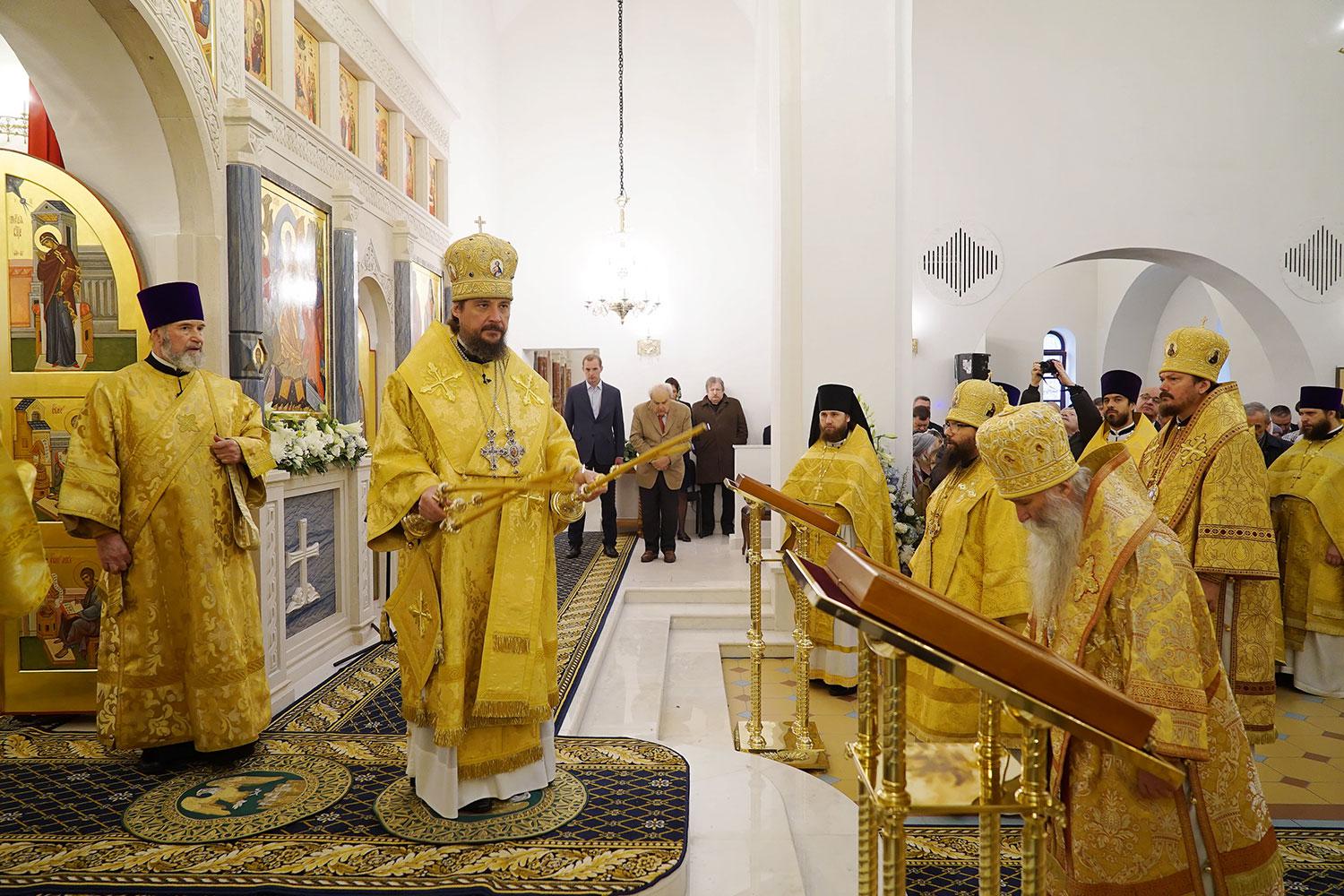 Архиепископ Сергий приветствовал участников богослужения от лица Предстоятеля Русской Православной Церкви, а затем обратился к ним со словом. Он поблагодарил строителей, благотворителей, благоукрасителей за труды по возведению и благоукрашению.