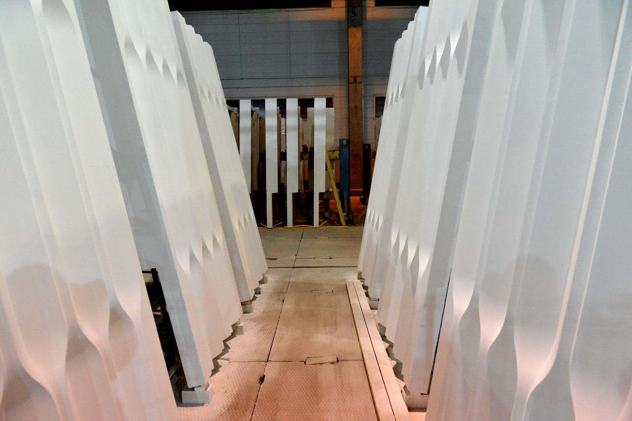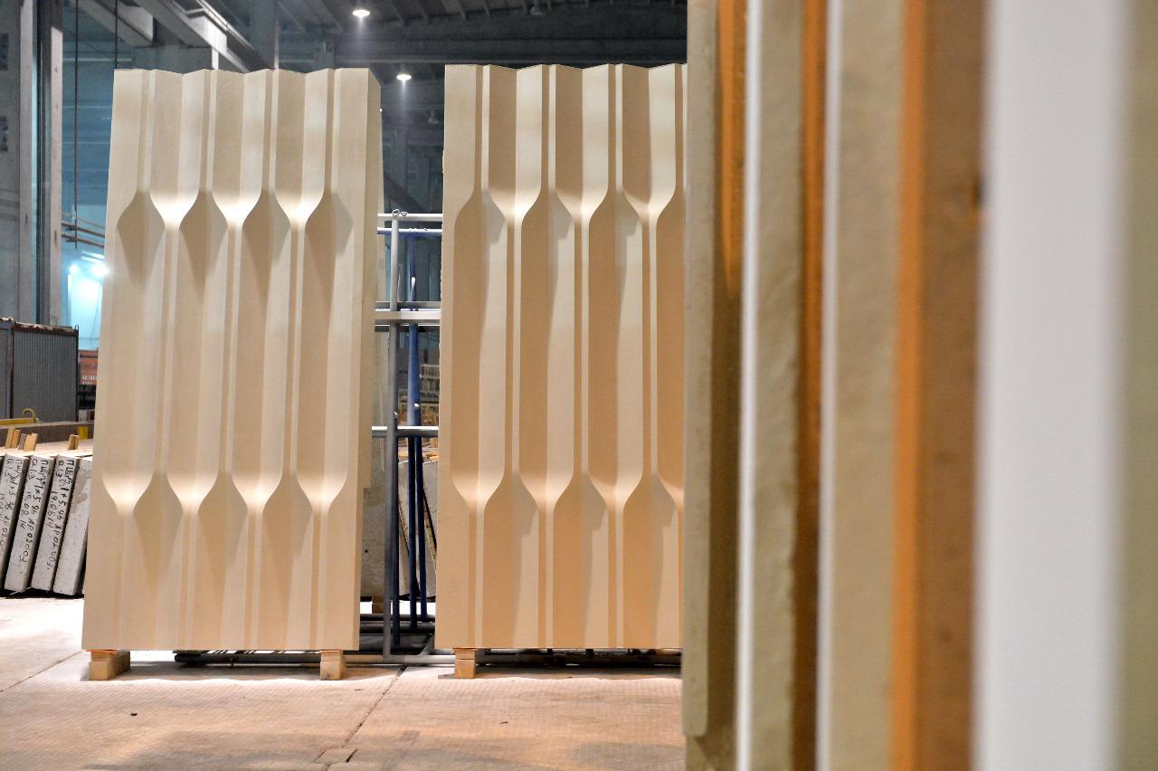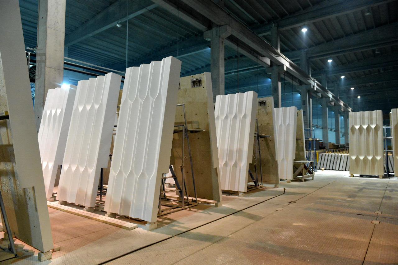 В итоге технологическое решение разработала отечественная фабрика «Мажино», которая придумала специальную технологию и специальную рецептуру бетона именно для этого проекта. Всего было изготовлено 4600 белоснежных панелей из железобетона общей площадью 25 000 кв. м. Вес каждой панели составляет 1350 кг, размеры 1,5 на 3,3 метра и 1,6 на 3,3 м. К монолитному основанию они крепятся с помощью специальных кронштейнов из нержавеющей стали, которые были специально разработаны для этого проекта.
