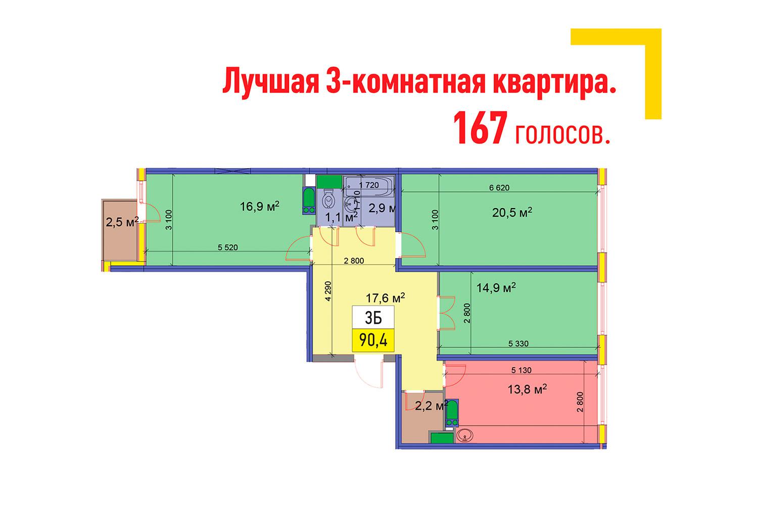 167 голосов набрала наиболее удовлетворяющая потребностям жителей планировка трехкомнатной квартиры тип 3Б площадью 90,4 кв. м (кухня – 13,8 кв.м, спальня – 16,9 кв.м, спальня – 20,5 кв.м, гостиная -14,9 кв.м, коридор – 17,6 кв.м, санузел – 1.1 кв.м, ванная – 2,9 кв. м, кладовая – 2,2 кв. м, балкон – 2,5 кв.м).