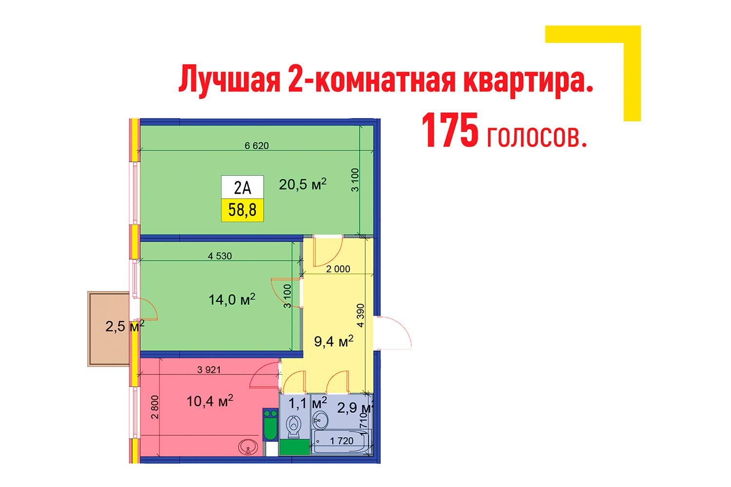 Планировка лучшей двухкомнатной квартиры тип 2А имеет общую площадь 58,8 кв. м и она набрала 175 голосов жителей (кухня – 10,4 кв.м, спальня – 20,5 кв.м, гостиная -14, 0 кв.м, коридор – 9,4 кв.м, санузел – 1.1 кв.м, ванная – 2,9 кв. м, балкон – 2,5 кв.м).