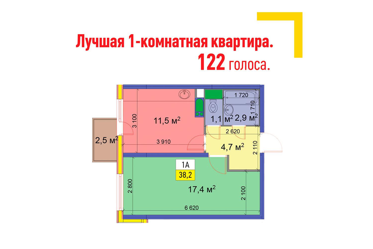 За лучшую планировку однокомнатной квартиры тип 1А было подано 122 голоса. Победила квартира площадью 38,2 кв.м (кухня – 11,5 кв.м, спальня – 17,4 кв.м, коридор – 4, 7 кв.м, санузел – 1.1 кв.м, ванная – 2,9 кв. м, балкон – 2,5 кв.м).