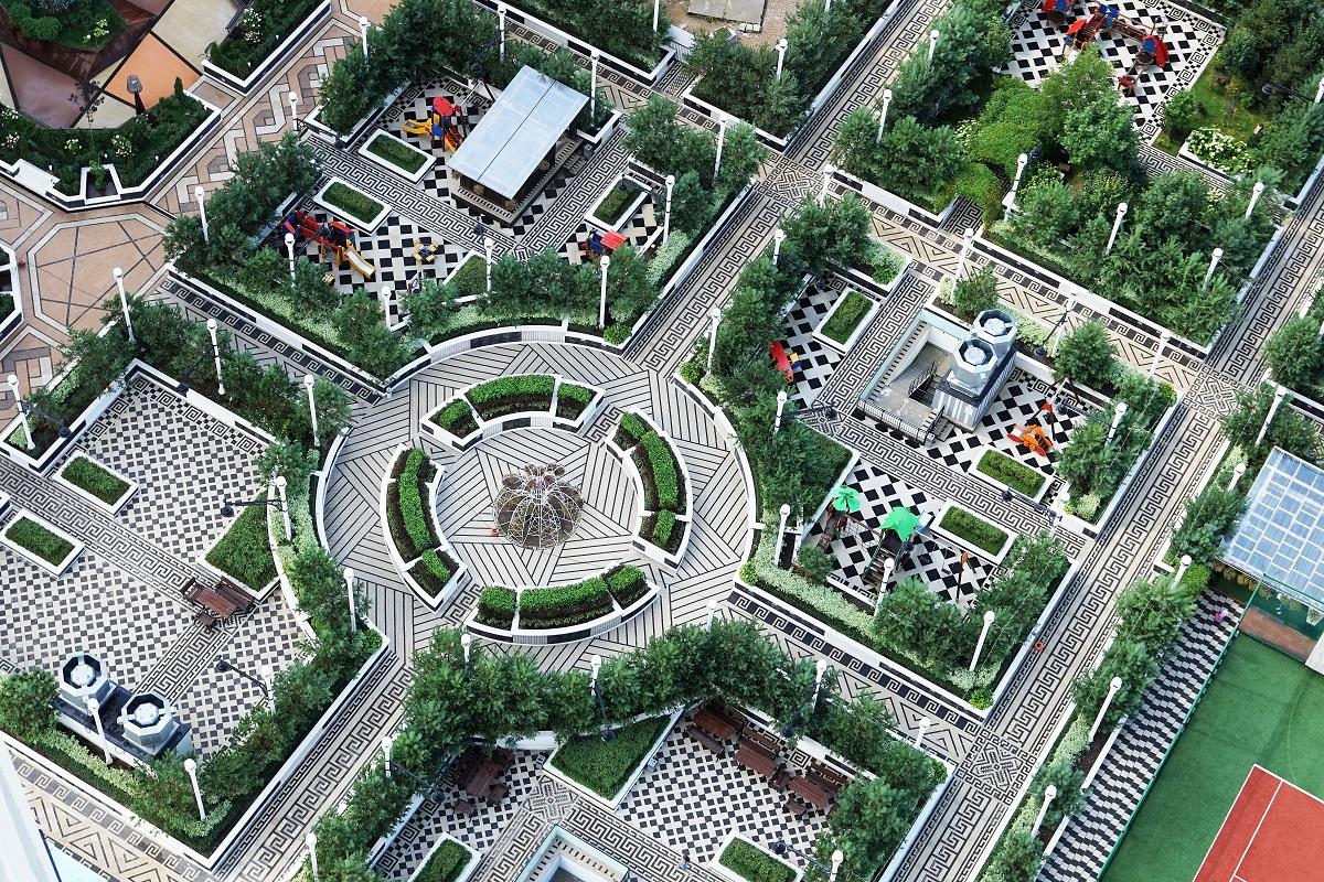 Жилой квартал имеет собственный парковый ансамбль, созданный по аналогии со знаменитыми садами во французском Версале. Он включает в себя озеленение крыш, огромный классический фонтан и обустроенные зоны для отдыха жильцов квартир: физкультурные площадки, теннисные корты, малые архитектурные формы.