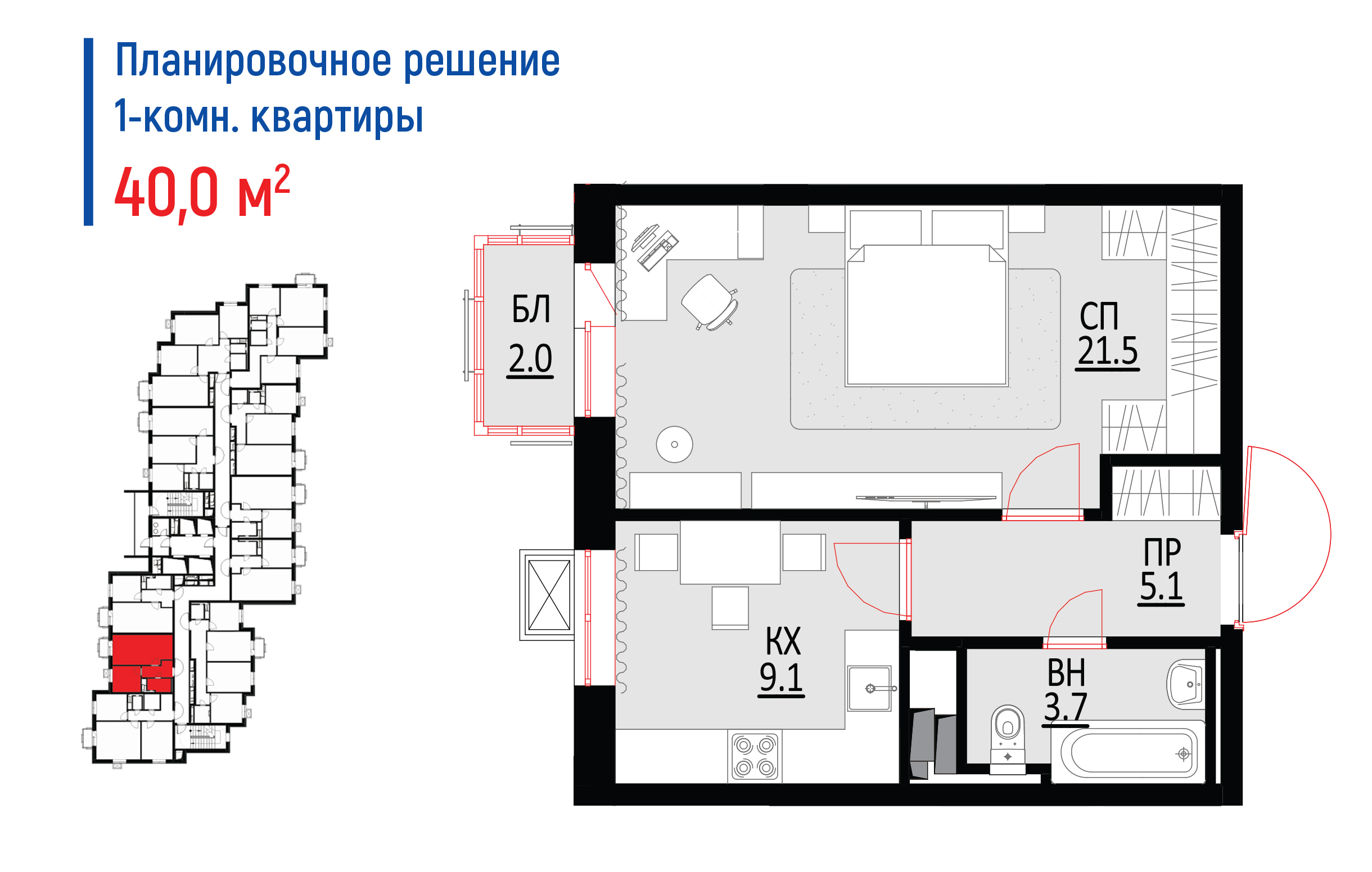 1-комнатные – 92 шт., 40 – 42,6 кв. м.
