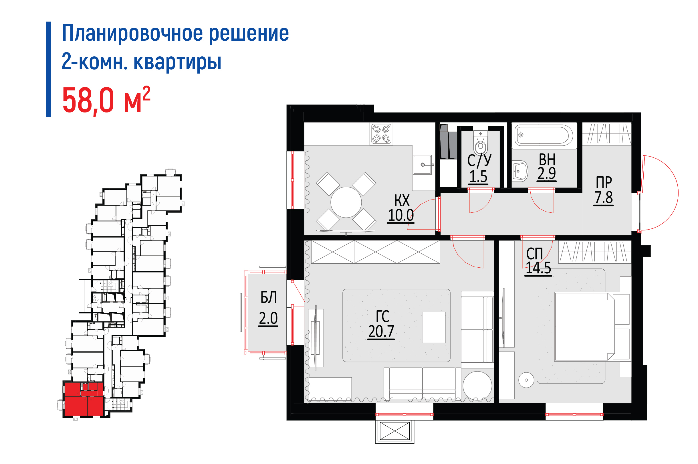 2-комнатные – 69 шт., 58 - 59,3 кв. м.