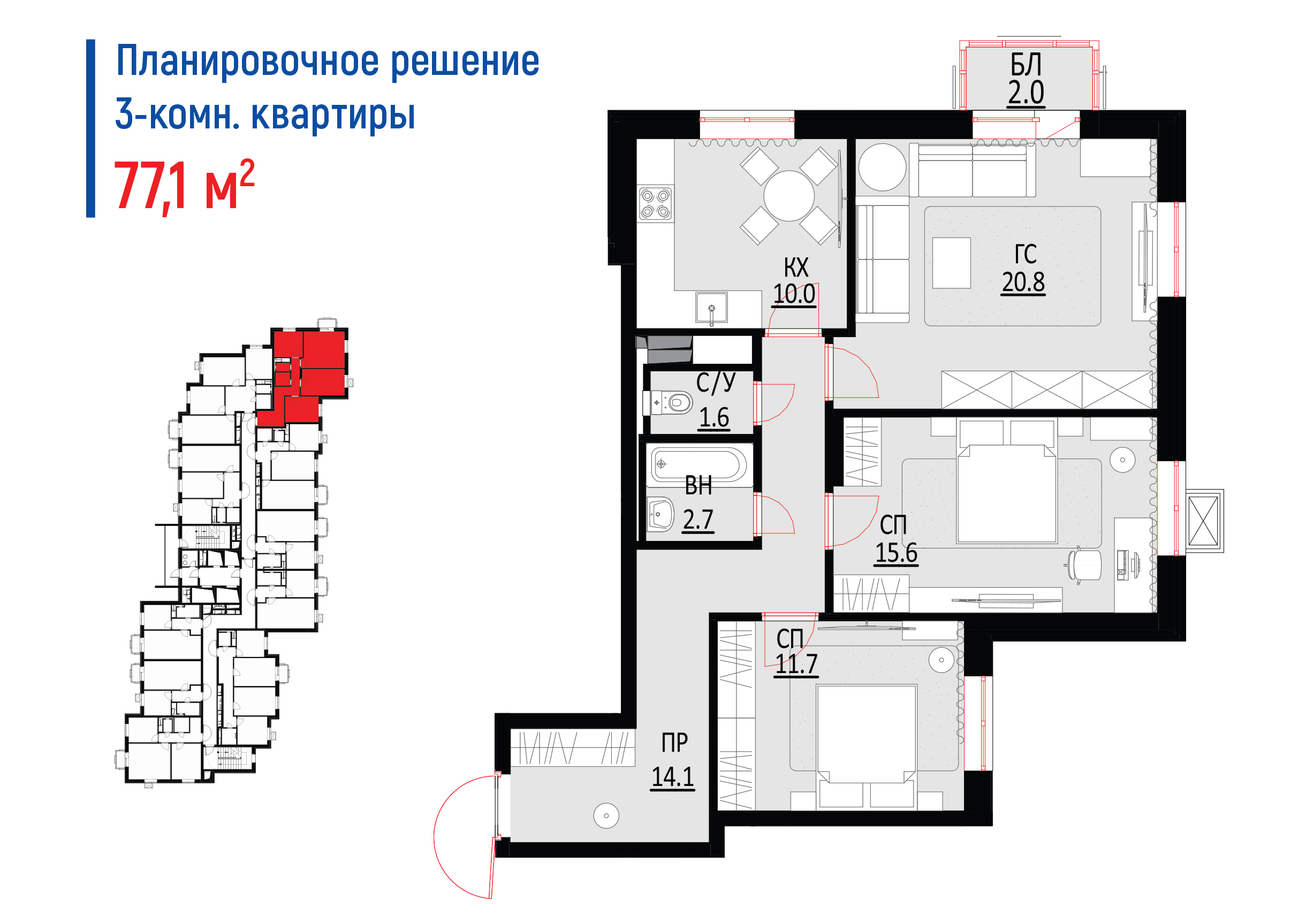 3-комнатные – 69 шт. 73,2 – 80,2 кв. м.